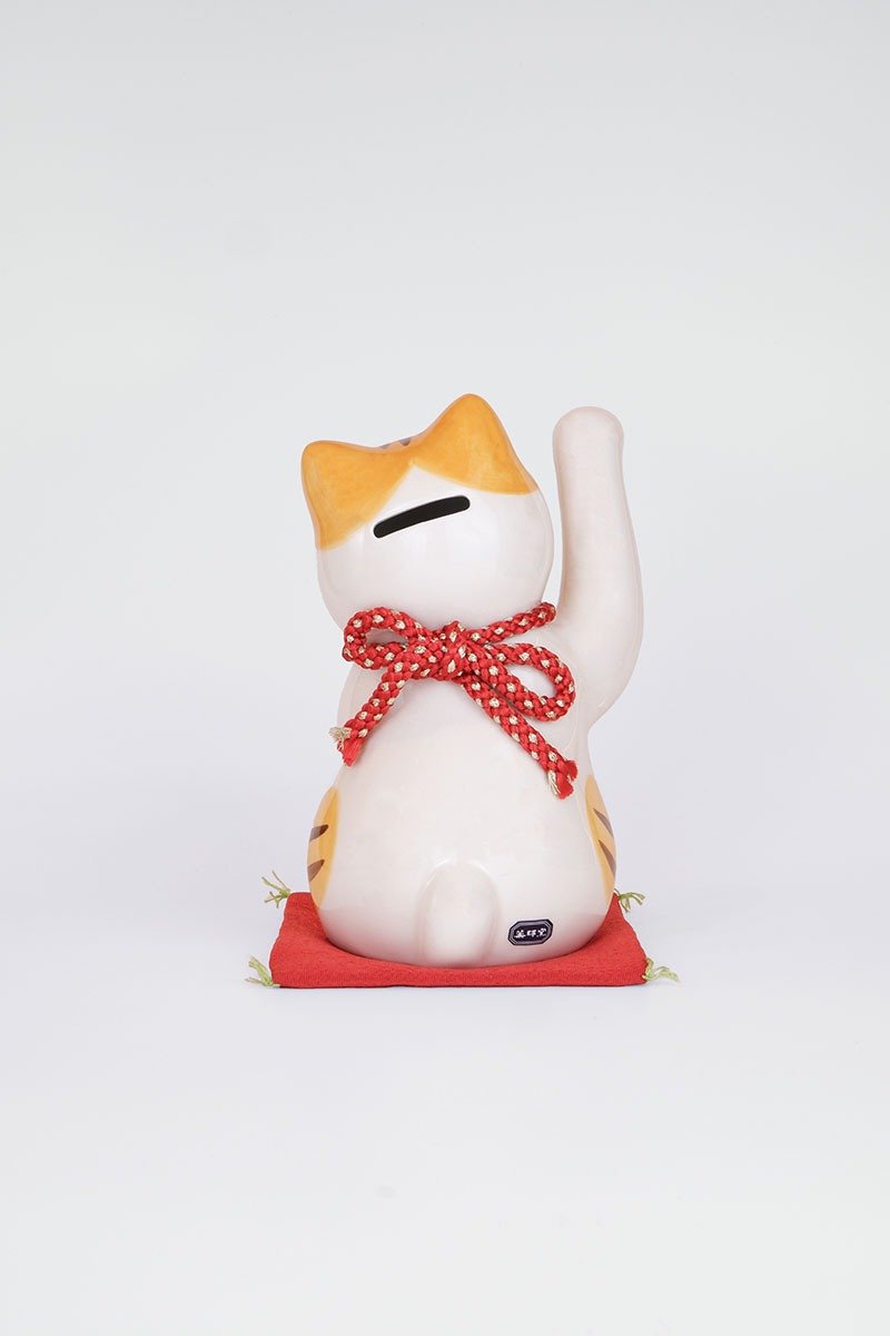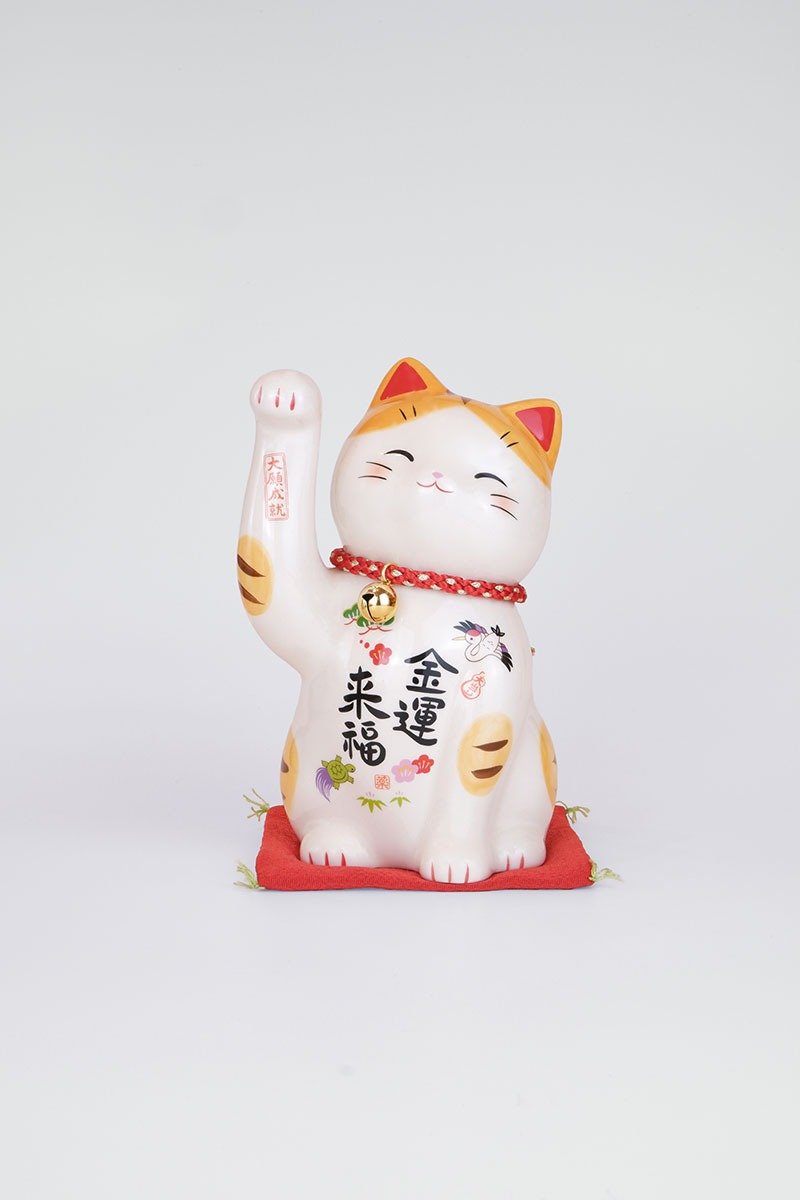 With its right paw raised, it invites abundance and luck. Hand-painted with golden and colorful details, this lively cat brings cheer and prosperity to homes, offices, or shops.